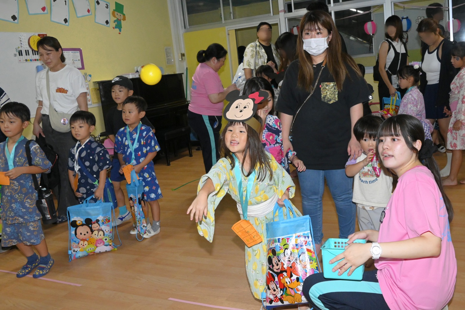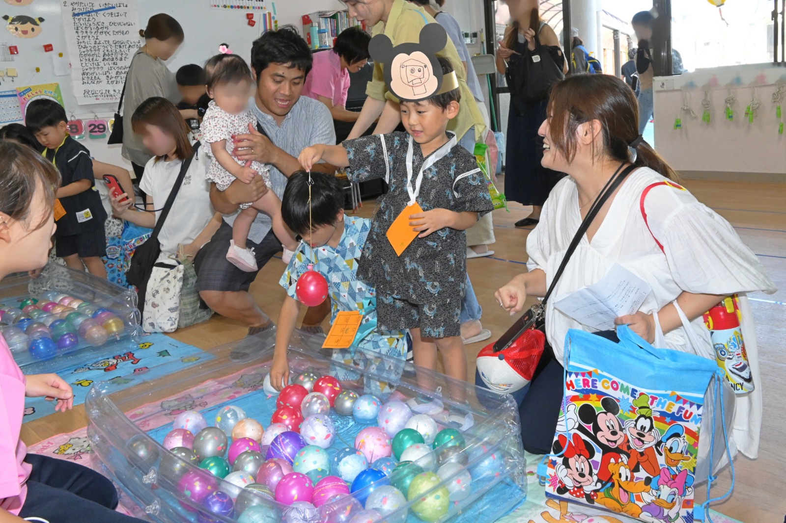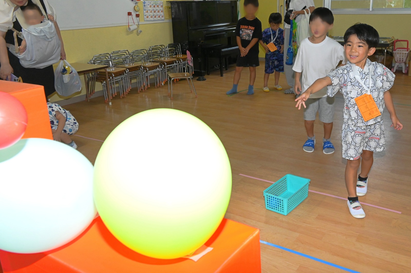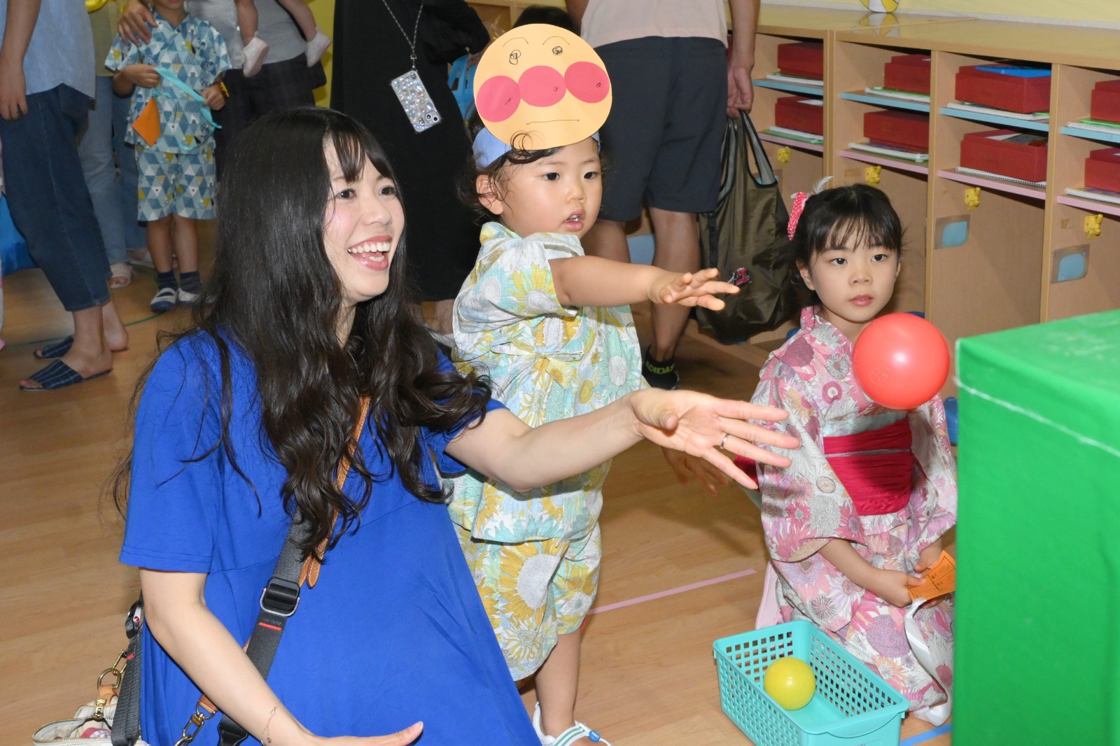 室内遊びは、ヨーヨー釣りや的当て、輪投げにおめん作りなどなど盛りだくさん!