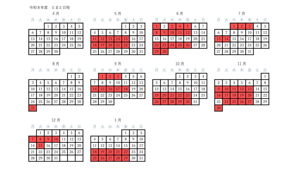 年に80日程度、平日実施(日程詳細は画像のカレンダーをご確認ください) ※原則、月ごと曜日固定の申し込みとなります |